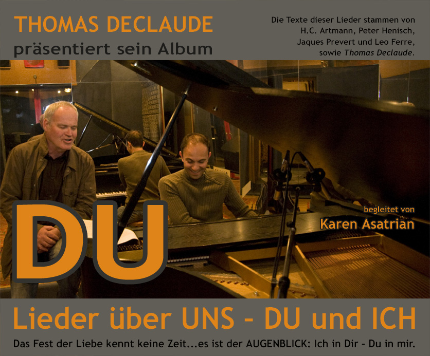 Thomas Declaude (voc., 12string-git.) singt Lieder aus seinem Album "Du", liest die Poesie bekannter Autoren (Shakespeare, Artmann, Henisch, Kusenberg u.a.)