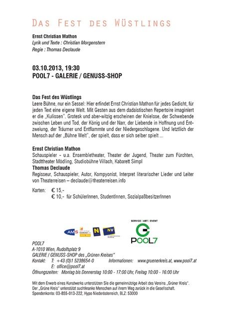 In das Programm fließen u.a. Texte von William Shakespeare, Peter Henisch, H.C. Artmann, Hans Dieter Hüsch, Jacques Prevert, Leo Ferre und aus Thomas Declaudes Gedichtband „Ich trag als Maske mein Gesicht“ sowie aus seinem Erzählband „Eselsohren einer Geschichte“ ein.