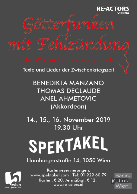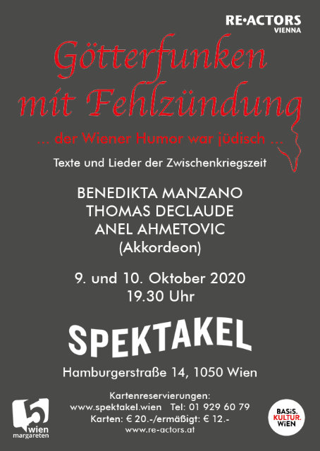 Gerade jetzt, wo Antisemitismus und Fremdenfeindlichkeit wieder grassieren, wollen die RE-ACTORS wenig bekannte Lieder und Texte jüdischer Künstler der Zwischenkriegszeit vor der Vergessenheit bewahren. Der so eigene Humor, den die Juden oft, und sogar in grösster Not, als Überlebensstrategie entwickelt haben, ist dabei vielleicht wichtigstes Zeugnis grossartiger Kreativität.