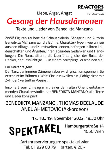 Zwölf Figuren zaubert die Schauspielerin, Sängerin und Autorin Benedikta Manzano auf die Bühne. Charakter-Typen, wie wir sie aus den Alltags- und Kunstwelten kennen, befangen in ihren Leidenschaften und Ängsten, ihren absurden Gedanken und Handlungen. Die Romantikerin, die Überfürsorgliche, der Boss, der Denker, der Sexsüchtige... - in einem Zerrspiegel erscheinen sie.